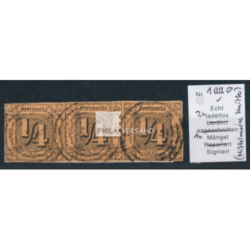 Ziffer 1854 - 1/4 Groschen im waagerechten Streifen zu drei Marken auf kleinem Briefstück, die mittlere Marke mit kaum erkennbarem Papierknitter, ansonsten präsentiert sich die seltene Einheit in ausgezeichnet geschnittener Erhaltung und die äußeren Marken tiefst geprüft Sem, BPP und mit Bewertungszettelchen (mittlere Marke etwas erhöht geprüft)