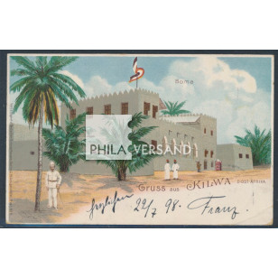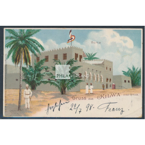 Adler 1898 - 5 Pesa auf 10 Pfennig als Einzelfrankatur und sehr gut lesbar entwertet " Dar-Es-Salam 26/7 98 " auf wunderbarer Litho-Ansichtskarte " Gruss aus Kilwa " mit tollen Einzelbildern gesendet mit Grußtext nach Posen (Ankunftstempel), karte bildseitig unten rechts mit Eckstauchung, ansonsten gute Bedarfserhaltung und mit Attest Steuer, BPP