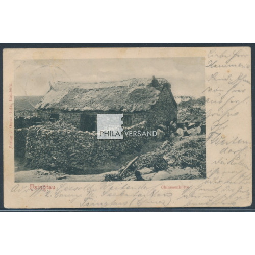 Tsingtau-Ausgabe 1900 - 5 Pfg auf 10 Pfennig Adler mit violettem Strich in seltener Type 3 und entwertet " Tsingtau 14/6 00 " als Einzelfrankatur auf Ansichtskarte mit tollem Motiv " Chinesenhütte " und gesendet mit viel Kartentext nach Neustadt (Ankunftstempel), Marke in einwandfreier Erhaltung, Karte mit üblichen Beförderungsspuren und mit Attest Jäschke-Lantelme, BPP