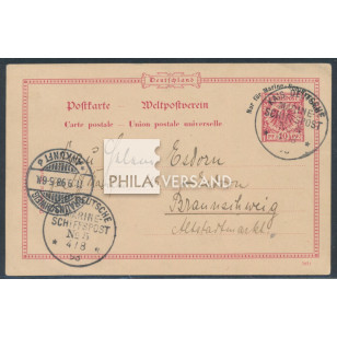 Manila-Blockade 1898 - 10 Pfennig Adler als Wertstempel auf Postkarte für Marine-Schiffsposten, perfekt entwertet MSP No. 5 (Prinzess Wilhelm) 4/8 05 und mit interessantem Text gesendet nach Braunschweig (Ankunftstempel). Prinzess Wilhelm war vom 20.6.98 bis 18.10.98 im Einsatz vor Manila während der Philippinen-Kriese, ein interessantes Stück in sehr guter Erhaltung