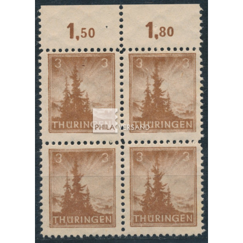 Tannen 1945 - 3 Pfennig im postfrischen Viererblock vom Oberrand mit Reihenwertzähler, einwandfrei postfrisch und gedruckt auf dünnem Papier (yy), Attest Schulz, BPP, seltene Einheit
