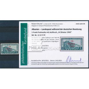 Aufdruckwert 1943 - 1 Frank mit Aufdruckfehler " 1 von 1943 unten verkürzt ", einwandfrei postfrisch und mit Befund Brunel, VPEV