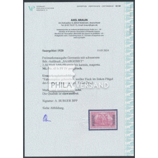 Aufdruck 1920 - 2,50 Mark mit seltenem Plattenfehler " Fahnenspitze gebrochen, weißer Fleck im linken Flügel des Genius ", einwandfrei postfrisch und mit Attest Braun, VPEV