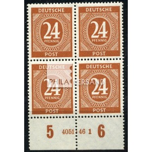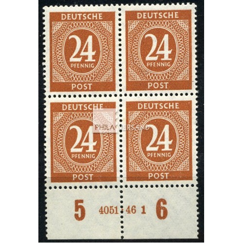 24 Pfg. Kontrollrat I 1946 Viererblock + HAN 4051.46 1 - sehr gute Erhaltung, einwandfrei postfrisch im Viererblock vom Unterrand mit Hausauftragsnummer