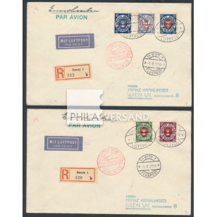 Freie Stadt Danzig 1931 - komplette Serie auf vier Belegen, vielfach sehr gut entwertet " Danzig Luftpost 4.5.31 " und jeder Beleg befördert per Luftpost und Einschreiben via Berlin (roter Luftpostbestätigungsstempel und Poststempel) via Prag (Transitstempel) nach Wien (Flugpost Ankunftstempel), ein ganz aussergewöhnliches Angebot, zudem mit dem originalen Posteinlieferungsschein auf dem alle vier Briefe verzeichnet sind