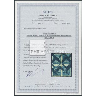 numeral 1923 - 20 Millionen rouletted stamp in a very rare block of four with special Lüdenscheid postmark, one stamp with rare plate variety PE 1, certificate by Weinbuch, BPP