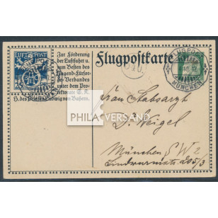 Munich airmail 1912 - official postcard with " BAEC " imprint on 25 Pfennig airmail value mark with 5 Pfennig Ludwig value mark and very clean cancelled with special " Flugpost München 4.10.12 " postmarks and with backside motif " alpine chain with Munich cathedral " in very good needs quality, Michel pioneer flight 15-02/b on postcard SFP 1 b