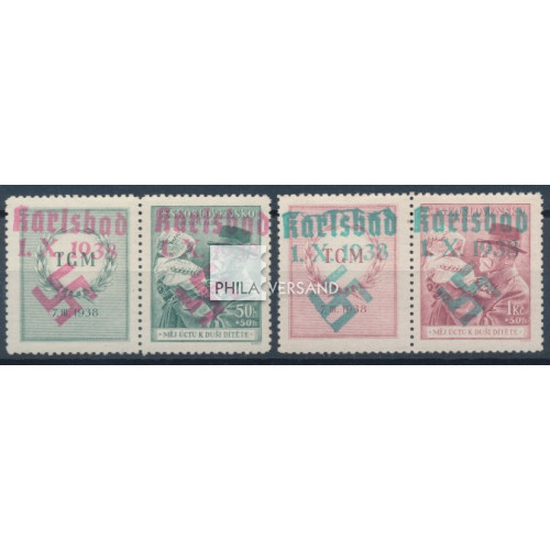 Karlsbad 1938 - Masaryk with child and with ornamental coupons with Karlsbad overprints in perfect hinged quality (stamps seems like mint never hinged), the 50 Heller stamp in better magenta overprint color and with certificate by Brunel, VPEV