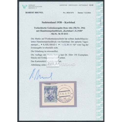 Karlsbad 1938 - Doss Alto with Karlsbad overprint in perfect used quality on small piece with first day postmark, a very rare offer and with certificate by Brunel, VPEV