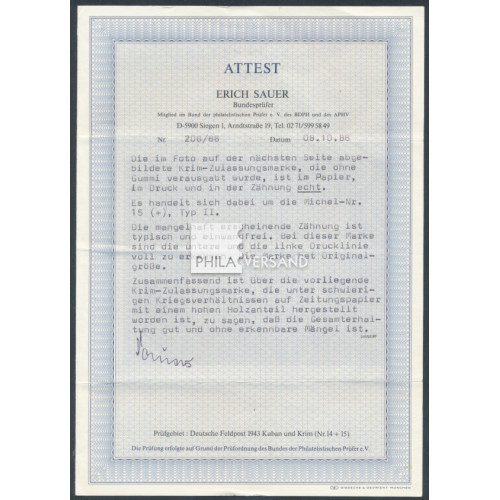 Krim parcel stamp 1943 - rare offer in type II as issued without gum, very good quality and with certificate by Sauer, BPP