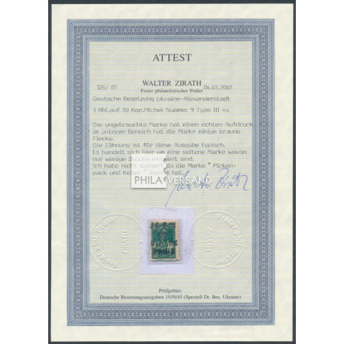 handoverprint 1942 - 3 R on 20 K in mint never hinged quality with full original gum, some typical brownish dots, a very rare stamp with certificate by Zirath