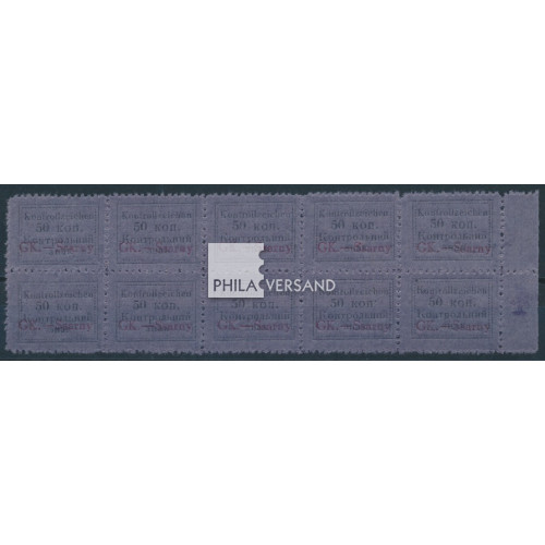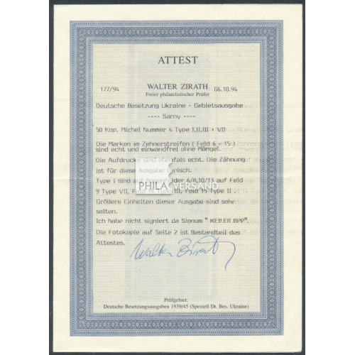 Sarny Local issue 1941 - 50 Kopeks perforated stamps as large part of 10 from a sheet with margin right side, seven stamps in printing type I, one stamp at a time is in type II, one in type III and one in type VII. Perfect mint without gum quality (as issued), left below stamp with small part of a hinge, a very rare offer with certificate by Zirath