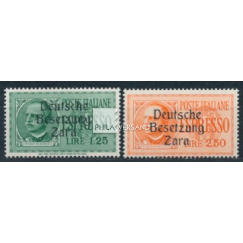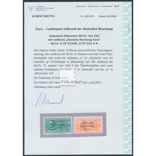 Express stamps 1943 - perfect mint never hinged quality with full original gum, the rare Michel# 22 with very rare overprint variety " small first e in Deutsche and n in Besetzung " (Michel Spezial 2025 cv 1000,- Euro) and also better overprint variety on Michel# 21, certificate by Brunel, VPEV