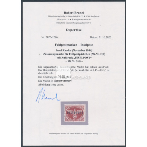 Rhodes local overprint 1944 - rouletted stamp in very good used quality and with certificate by Brunel