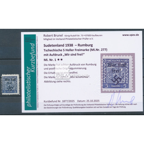 Rumburg 1938 - 5 Heller coat of arms with Rumburg overprint in perfect mint never hinged quality and with certificate by Brunel, VPEV