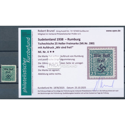 Rumburg 1938 - 25 Heller coat of arms with Rumburg overprint in perfect mint never hinged quality, left side some rough perforations and with certificate by Brunel, VPEV