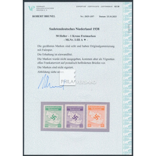 Sudetendeutsches Niederland 1938 - very rare perforated full set in perfect very lightely hinged quality and with certificate by Brunel, VPEV