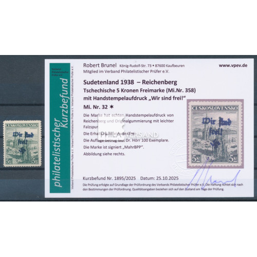 Reichenberg 1938 - 5 crowns Olmütz with Reichenberg overprint in perfect mint very lightely hinged quality (stamp seems like MNH quality) and with certificate by Brunel, VPEV