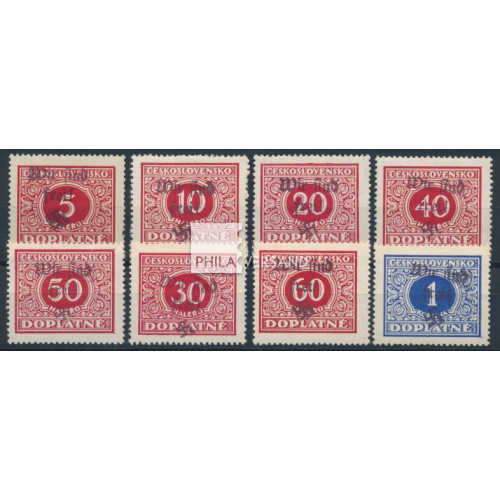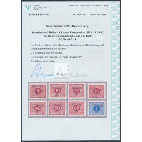 Reichenberg 1938 - 5 Heller to 1 Crown postage due stamps with Reichenberg overprint in perfect mint hinged quality and with certificate by Brunel, VPEV