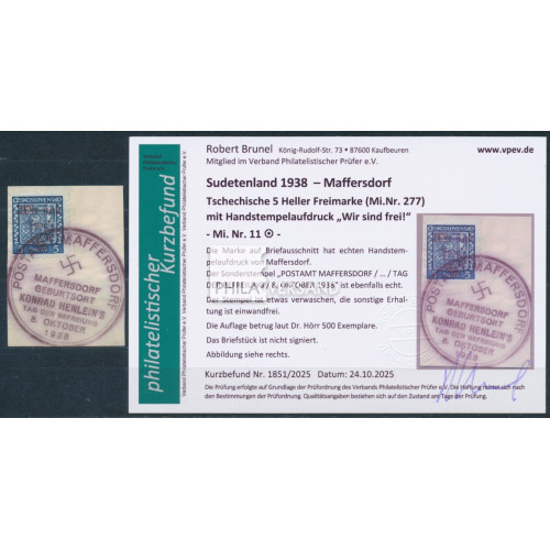 Maffersdorf 1938 - 5 Heller coat of arms with Maffersdorf overprint on small piece with special postmark, very good quality and with certificate by Brunel, VPEV