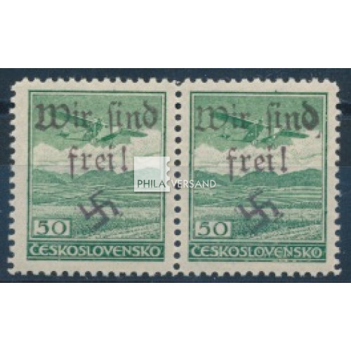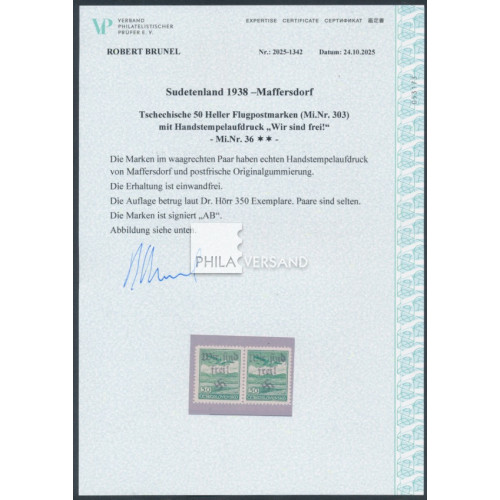 Maffersdorf 1938 - 50 Heller airmail stamp with Maffersdorf overprint in perfect mint never hinged quality and rare horizontal pair with certificate by Brunel, VPEV