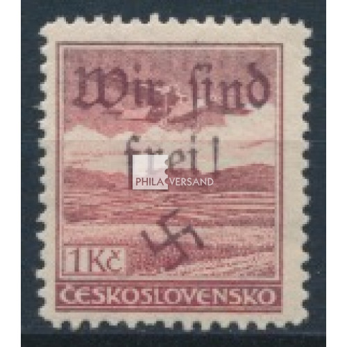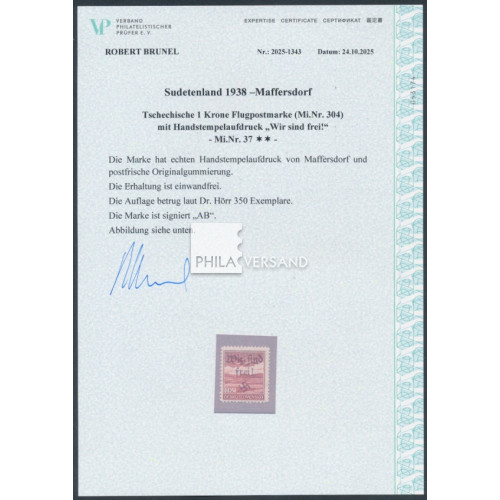 Maffersdorf 1938 - 1 Crown airmail stamp with Maffersdorf overprint in perfect mint never hinged quality and with certificate by Brunel, VPEV