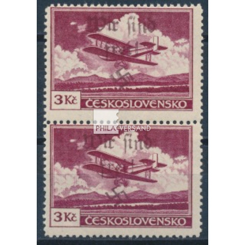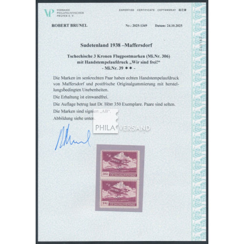 Maffersdorf 1938 - 3 Crowns airmail stamp with Maffersdorf overprint in perfect mint never hinged quality and rare vertical pair with certificate by Brunel, VPEV