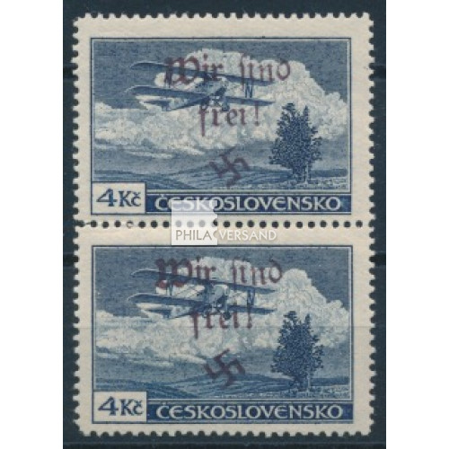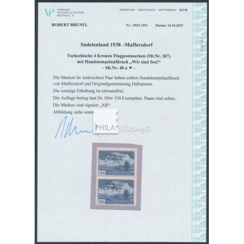 Maffersdorf 1938 - 4 Crowns airmail stamp with Maffersdorf overprint in very good mint hinged quality and rare vertical pair with certificate by Brunel, VPEV