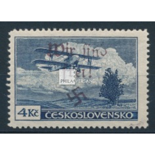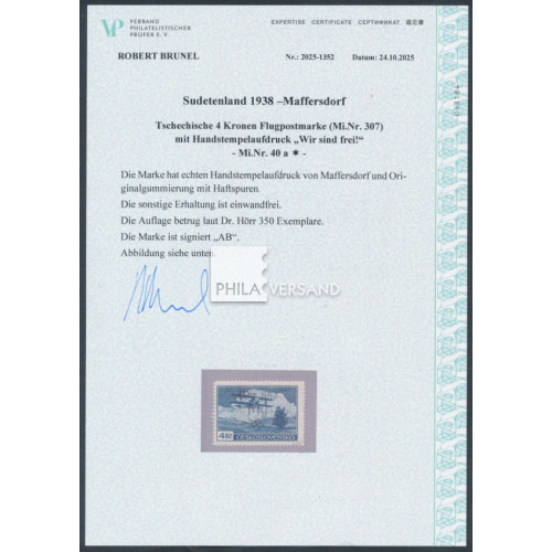 Maffersdorf 1938 - 4 Crowns airmail stamp with Maffersdorf overprint in very good mint hinged quality and with certificate by Brunel, VPEV