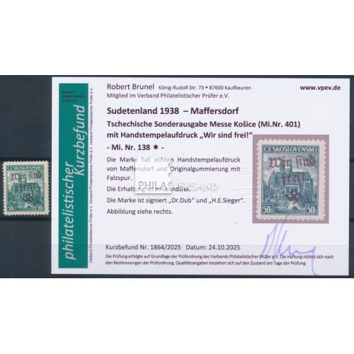 Maffersdorf 1938 - 50 Heller Kosice exhibition with Maffersdorf overprint in very good mint lightely hinged quality and with certificate by Brunel, VPEV
