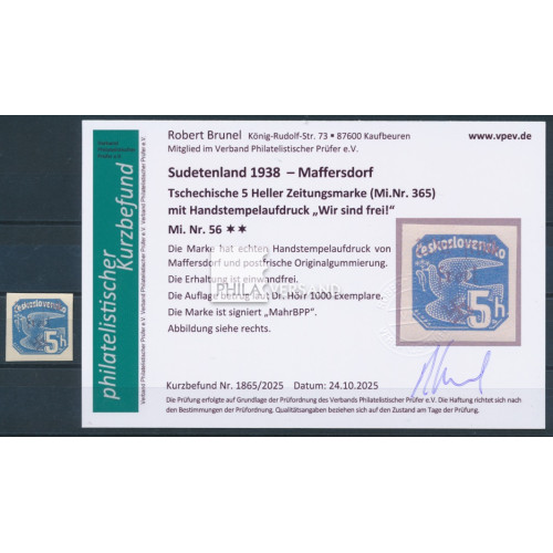 Maffersdorf 1938 - 5 Heller newspaper stamp with Maffersdorf overprint in perfect mint never hinged quality and with certificate by Brunel, VPEV