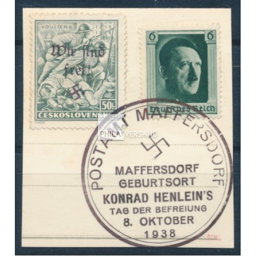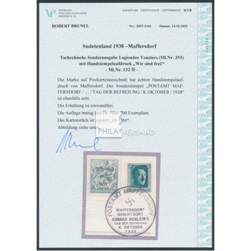 Maffersdorf 1938 - 50 Heller Vouziers stamp with Maffersdorf overprint in perfect used quality with additional postage on small piece and with certificate by Brunel, VPEV