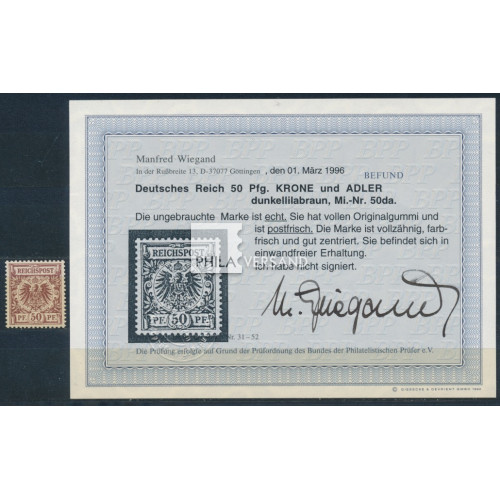 eagle 1897 - 50 Pfennig in perfect mint never hinged quality without any signatures, better color and with certificate by Wiegand, BPP