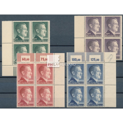 Hitler 1944 - Mark issues in perforation 14 in perfect mint never hinged blocks of four without any signatures, the 2 mark stamp with margin left side, the other blocks of 4 from the sheet corners