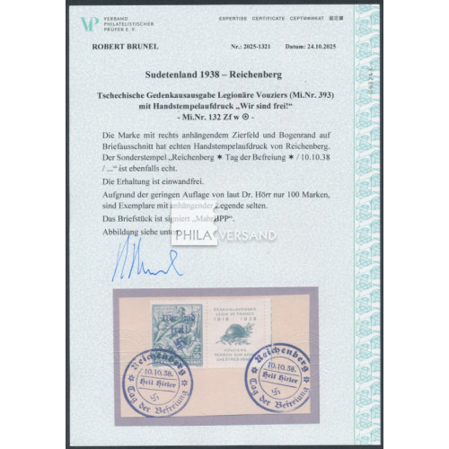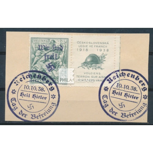 Reichenberg 1938 - 50 Heller Vouziers woth Reichenberg overprint and with special ornamental coupon right side and also with margin on small piece in perfect used quality with two special Reichenberg postmarks and with certificate by Brunel, VPEV