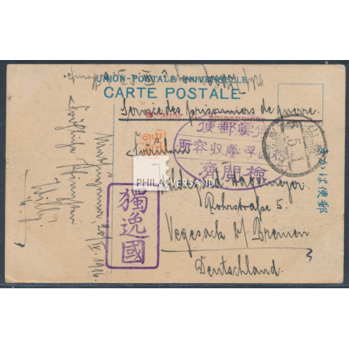 Matsuyama POW Camp 1916 - ppc with great railroad motif sent from camp Matsuyama with large violet camp seal, Doitsu-Koku mark (Germany), postmark from Matsuyama 1.5.5 (1916) and HAN by Motomiya as well as red SDPDG mark sent to Germany - very good needs quality