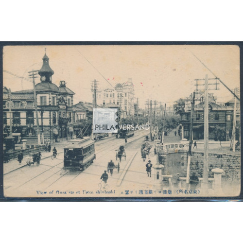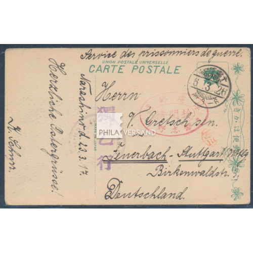 Narashino POW Camp 1917 - ppc with great motif " View of Guza str et From shinbashi " with great tram pictures sent as pow postcard by the german pow Karl Schurr with Chiba-Tsudanuma postmark 26.3.6 (1917) with very clean red camp seal, HAN censor mark from Kawamura and postcode mark for Germany, in Germany cancelled with better censor mark from Emmerich, perfect needs quality