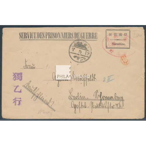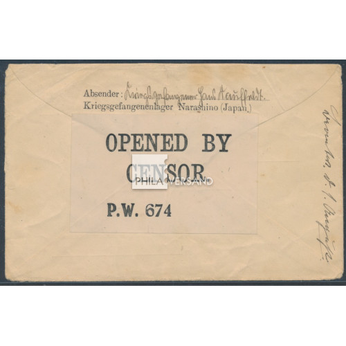 Narashino POW Camp 1918 - camp envelope sent by the pow Hans Kauffeldt with Chiba-Tsudanuma postmark 13.5.7 (1918) with red camp seal, HAN censor mark from Tanaka and postcode mark for Germany and backside british censor label sent to Berlin, small cut cover right side, otherwise very good needs quality