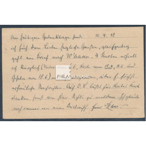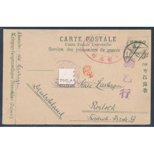 Narashino POW Camp 1918 - camp postcard sent by the german pow Hans Hashagen with Chiba-Tsudanuma postmark 10.9.7 (1918) with red camp seal, HAN censor mark from Tanaka and postcode mark for Germany as well as Tokyo transit postmark sent to Rostock, small diagonal transport bug right side, otherwise very good needs quality