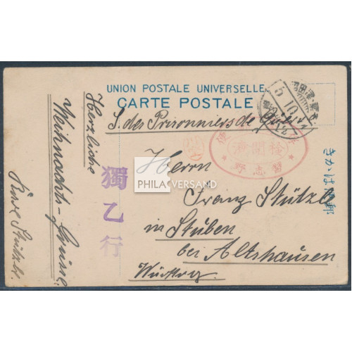 Narashino POW Camp 1916 - beautyful camp postcard with great motif sent by the german pow Karl Stützle with Chiba-Tsudanuma postmark 11.10.5 (1916) with red camp seal, HAN censor mark from Kawamura and postcode mark for Germany sent to Stuben near Abtshausen, perfect needs quality