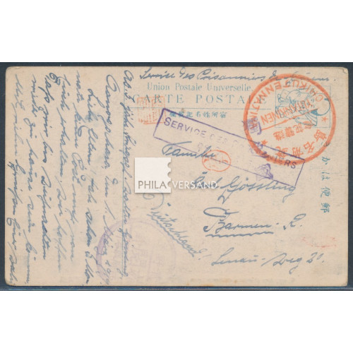 Aonagahara POW Camp 1917 - beautyful ppc sent by the german pow Walter Gössling from camp Aonagahara with the small camp seal, HAN censor marks from Inada and also Shoshi, SdPdG mark used former times in Himeji (Seitz type II) and postcode mark for Germany as well as a large red tourists mark sent to Barmen, very good needs quality