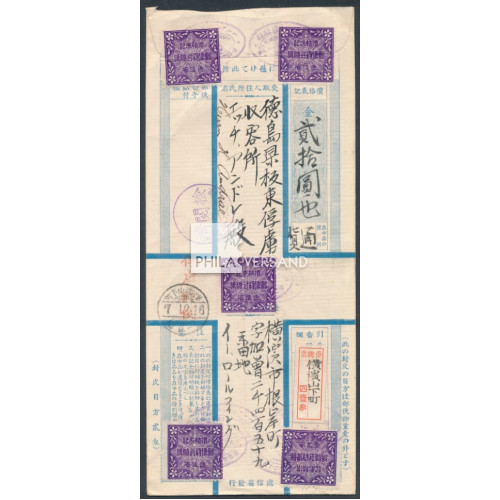 Bando POW Camp 1918 - money letter sent from Yokohama with five seal stamps with Yokohama postmark 16.12.7 (1918) to Hans Andrae in Camp Bando. A very rare piece in perfect quality