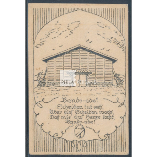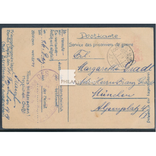 Bando POW Camp 1919 - camp ppc (called Bando-ade card) sent by the pow Franz Gradl with Bando postmark 12.12.8 (1919) with better violet camp seal in type I, postcode mark for Germany sent to Munich, nearly perfect quality and a very rare offer