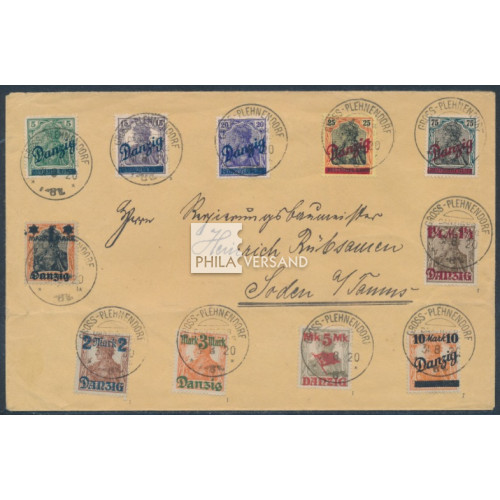 Germania 1920 - diagonal Danzig overprint as well as new values, each issue in a full set!! and each stamp with perfect and better postmark " Gross-Plehnendorf 31 8 20 Danziger Niederung " on letter with a Bad Soden address, backside expertized by Tworek, BPP, a very decorative offer