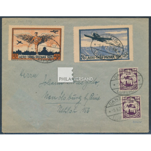 TARG + airmail 1921 - polish semi-official TARG airmail stamps with 60 Pfennig Danzig airmail stamps in two copies, each stamp with perfect " Danzig 1 Luftpost 5.6.21 " postmark on letter with address from Peine, very good quality, lower left side maybe was a airmail label - this one fell off during the transport, very good needs quality