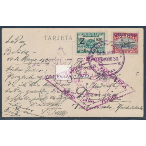 South America Flight 1930 - bolivian post sent with two Zeppelin stamps frm La Paz 14.May 1930 to Rio, carried with airship to Friedrichshafen (arrival postmark) and forwarded to the receivers address to Danzig, a rare Zeppelin destination with this flight, Michel Zeppelin specialized catalogue 68 C a, Sieger 60 A