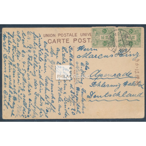 Homecoming mail 1920 - 6th home transport with steamer Nankai on ppc with 2 copies 2 Sen stampas (both stamps damaged) to Apenrade, written " Deutsches Mariene-Hospital Yokohama "with postmark 30.1.1920. Sender was the german pow Carl Hinz who was a german pow in Camp Bando with very interesting card text because of the home transport. With this last transport the few past pow' s and civilians were brought home to Germany, very good needs quality
