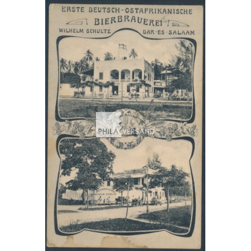 yacht 1911 - 4 Heller with watermark as single franking on better ppc with great motif " Erste Deutsch-Ostafrikanische Bierbrauerei.. " with two single pictures and very good readable postmark " Daressalam 14.8.11 " sent with very much interesting card text to Itzehoe, very good needs quality