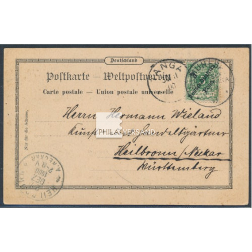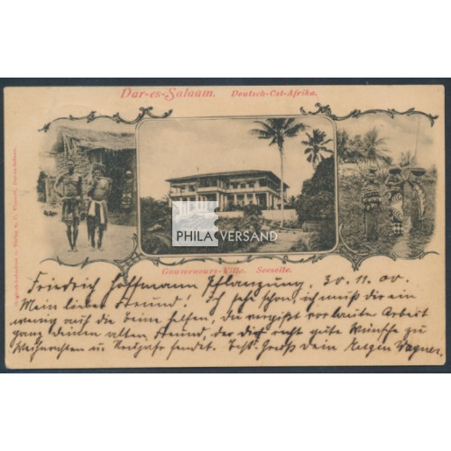 crown 1900 - 3 Pesa on 5 Pfennig as single franking on better ppc with great motif " Dar-Es-Salam " with three single pictures (f.e. Gouverneurs-Villa) with very good centric postmark " Muhesa 30/11 00 " sent with a lot of card text via Tanga to Heilbronn (transit and arrival postmarks), nearly luxury quality