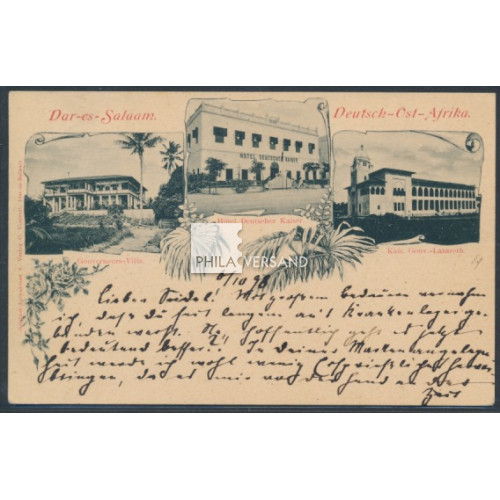 eagle 1898 - 5 Pesa on 10 Pfennig as single franking on better ppc with great motif " Dar-es-Salam " with three single pictures (Kais. Gouv.-Lazarett; Gouverneurs-Villa; Hotel Deutscher Kaiser) with postmark " Dar-Es-Salam 8/10 98 " sent with a lot of card text to Limbach (arrival postmark), nearly luxury quality